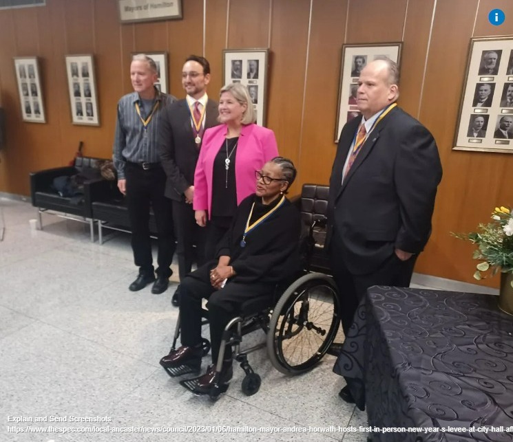 | Hamilton Mayor Andrea Horwath hosts first in-person New Year’s Levee at city hall after two yearsIn a departure by past mayors holding one New Year’s levee at city hall, Mayor Andrea Horwath believes there should be more of them for the community to enjoy. After two years without in-person levees, Horwath held the first of five citywide levees on Jan. 4 on the second floor of Hamilton City Hall, the first time it was held on a weekday evening. “I just thought it was a positive way to start off the new term of council by saying to the people of Hamilton, no matter what part of the city you reside in, we are all part of one big city,” said Horwath in an interview. The mayor said the idea came from someone during the recent election campaign, to hold multiple levees across the city. “We are a city of many communities,” said Horwath. “It just reflects for me the ties that bind us.” The Glanbrook Municipal Service Centre is slated to host the Jan. 5 New Year’s Levee, followed by Ancaster on Jan. 6, both starting at 7 p.m. and running until 9 p.m. The Stoney Creek Municipal Service Centre planned its levee for Jan. 7, from 1 p.m. to 3 p.m., and Flamborough and Dundas are set to host levees on Jan. 8, from 1 p.m. to 3 p.m. and 4 p.m. to 6 p.m. respectively. The public is encouraged to bring a non-perishable donation for the local food bank. Adding to Horwath’s attempts to unite the community after 23 years of being an amalgamated city, the mayor bestowed the Order of Hamilton medals on four Hamiltonians during the event. Horwath will be presenting the honour to other residents at the upcoming levees as well.“This is not just a symbolic order, but also a representation of the way we are all part of something,” said Horwath. “We are all in this together and we all have to support each other. There are lots of people doing great things in all parts of our city.” The recipients of the Order of Hamilton were Bill Custers, senior manager at Cable 14, who provided valuable information during the COVID-19 pandemic; Mike Moore, president of Hamilton Challenger Baseball Association; Karen Nelson, a 30-year volunteer who co-founded the Hamilton Youth Steel Orchestra and has volunteered for the Trinidad and Tobago Association of Hamilton; and Dr. Steven Zizzo, medical director of Winterberry Family Medicine, who volunteered his clinic to deliver high volume vaccine capacity to Hamilton Public Health during the COVID-19 pandemic. It has been the largest private immunization campaign in Canada, said Horwath. “There is no shortage or desire of people here (to volunteer),” said Horwath to the estimated 100 people who braved a cold, rainy evening.Holding the levee, said Horwath, who became the first women to sit in Hamilton’s mayor’s chair after winning a closely contested municipal election last October, is a chance to “renew some hope and optimism” for 2023 after two years without an in-person levee.The Order of Hamilton was created in 2019 by former mayor Fred Eisenberger when he awarded nine individuals with the medal and pin during his last in-person New Year’s Levee in Jan. 5, 2020. Eisenberger did conduct virtual New Year’s levees in 2021 and 2022, and announced the recipients during the events.The city created the order as a way to recognize “the unsung heroes of our communities (who) are the endless volunteers.” Also attending the Jan. 4 event was Hamilton Mountain NDP MPP Monique Taylor, and councillors Tammy Hwang of Ward 4 and Glanbrook Coun. Mark Tadeson.Tadeson said it was his first time attending a Hamilton levee event, which was competing with a Hamilton Bulldogs hockey game, and he was interested to meet and greet residents. Horwath’s interview with reporters was interrupted by Canadian entertainment icon Luba Goy, who embraced the mayor.”I have stars in my eyes,” said Horwath, who quickly held Goy and stood with her for cellphone photos.Horwath’s first levee, which lasted from 7 p.m. to 9 p.m., was broadcast by Cable 14 and hosted by Mike Fortune. |